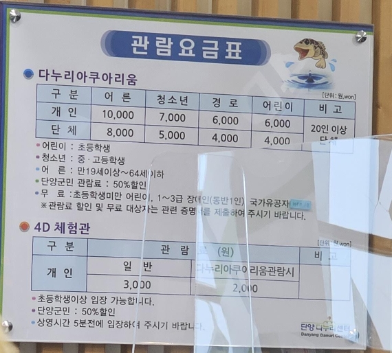 단양 다누리 아쿠아리움 관람 요금표