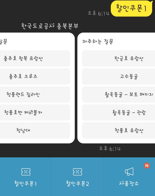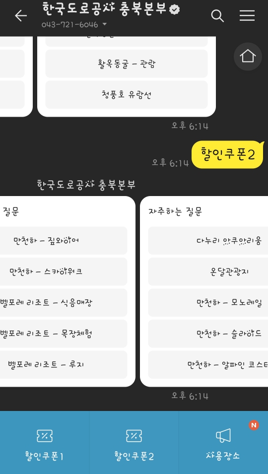 한국도로공사 충북본부 카카오채널 -> 필요한 쿠폰 검색하기!