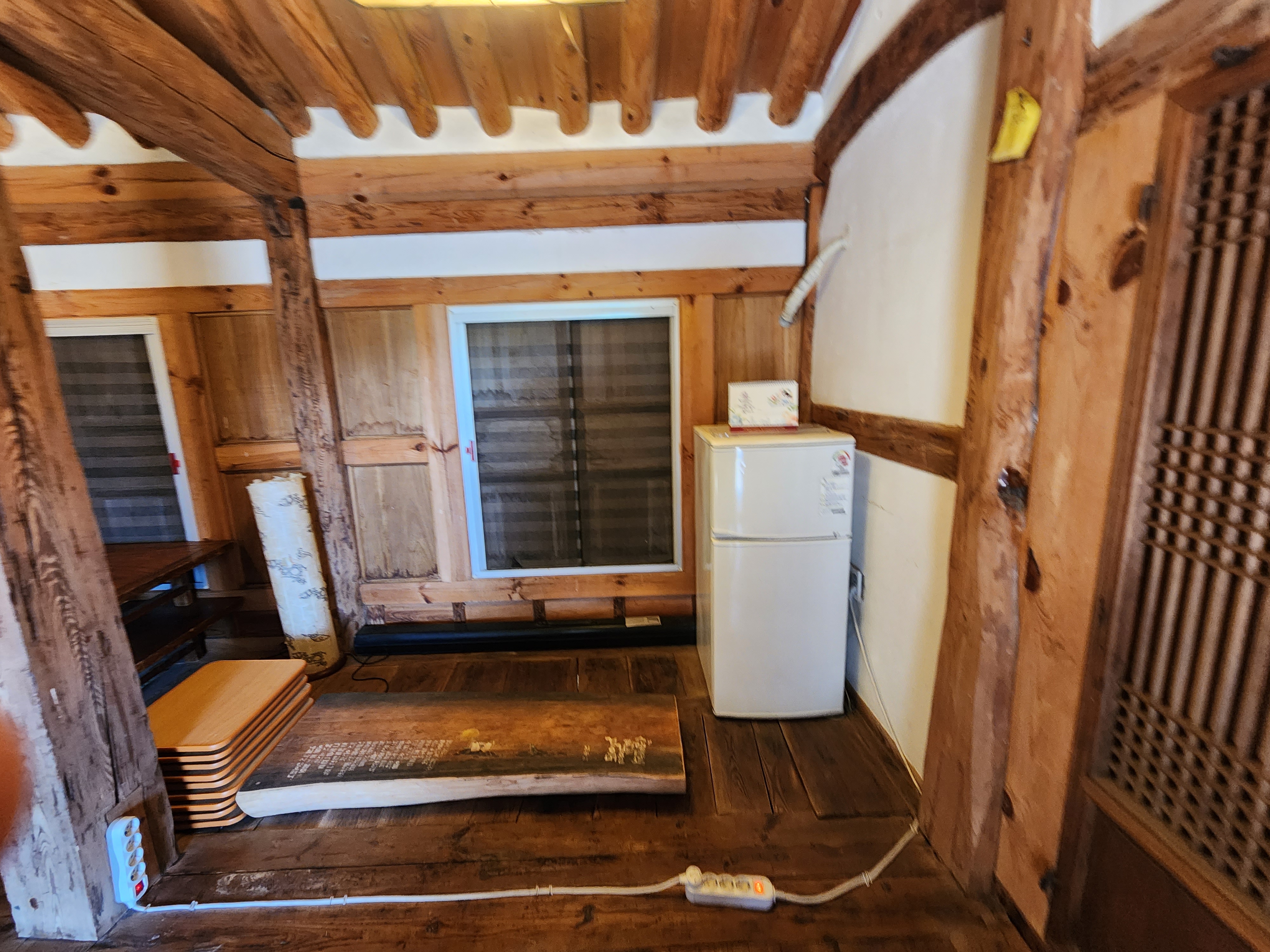 경주 고택 수오재 거실에 냉장고가 있어요.