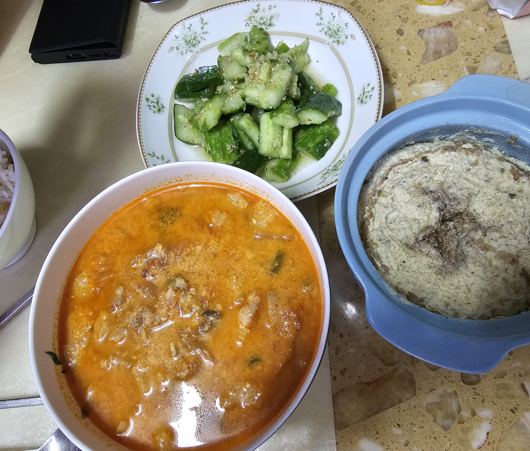 오이 탕탕이, 달걀찜, 장조림, 김치랍니다.