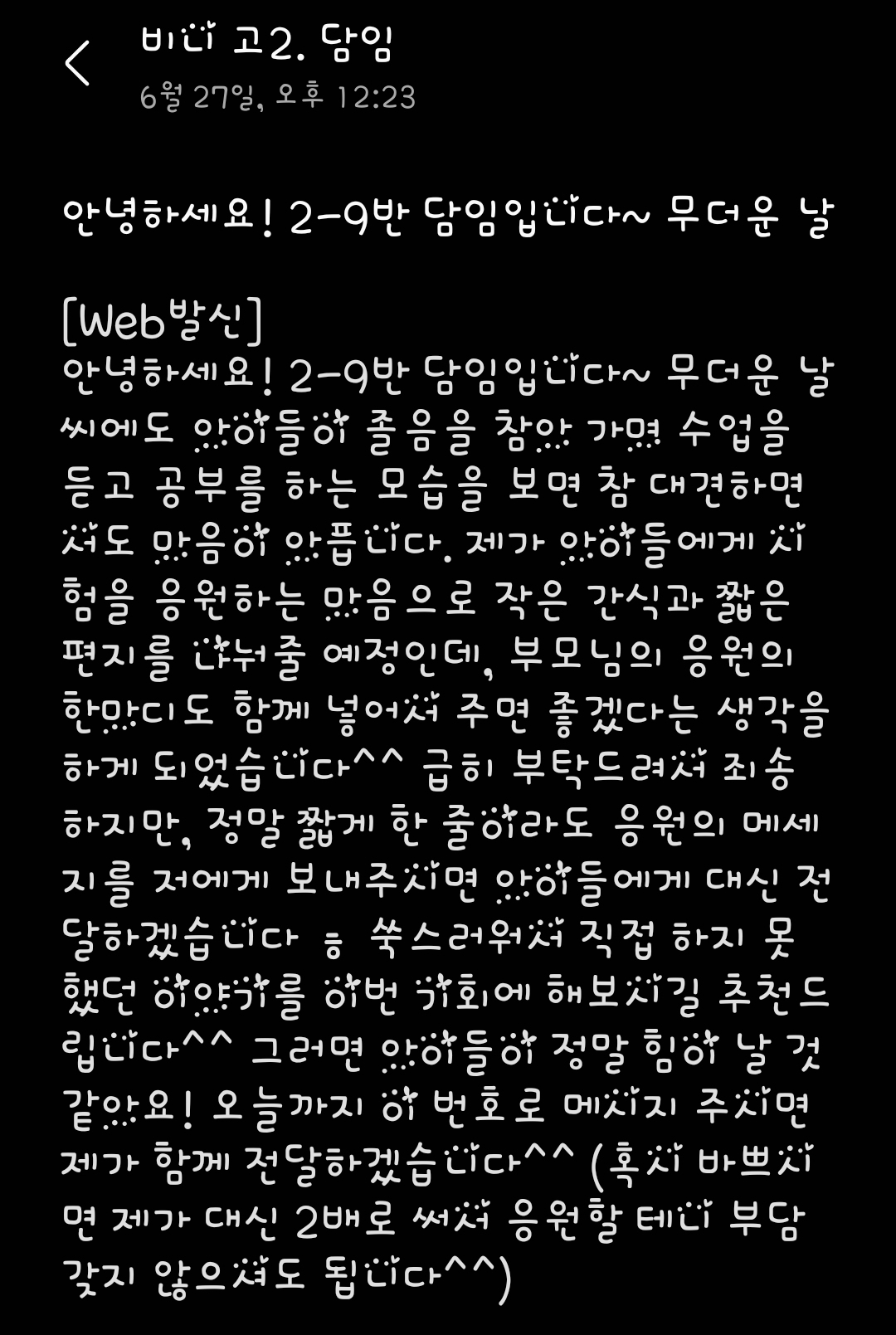 담임쌤 문자 이번에 아이들이 기말고사 시험이라